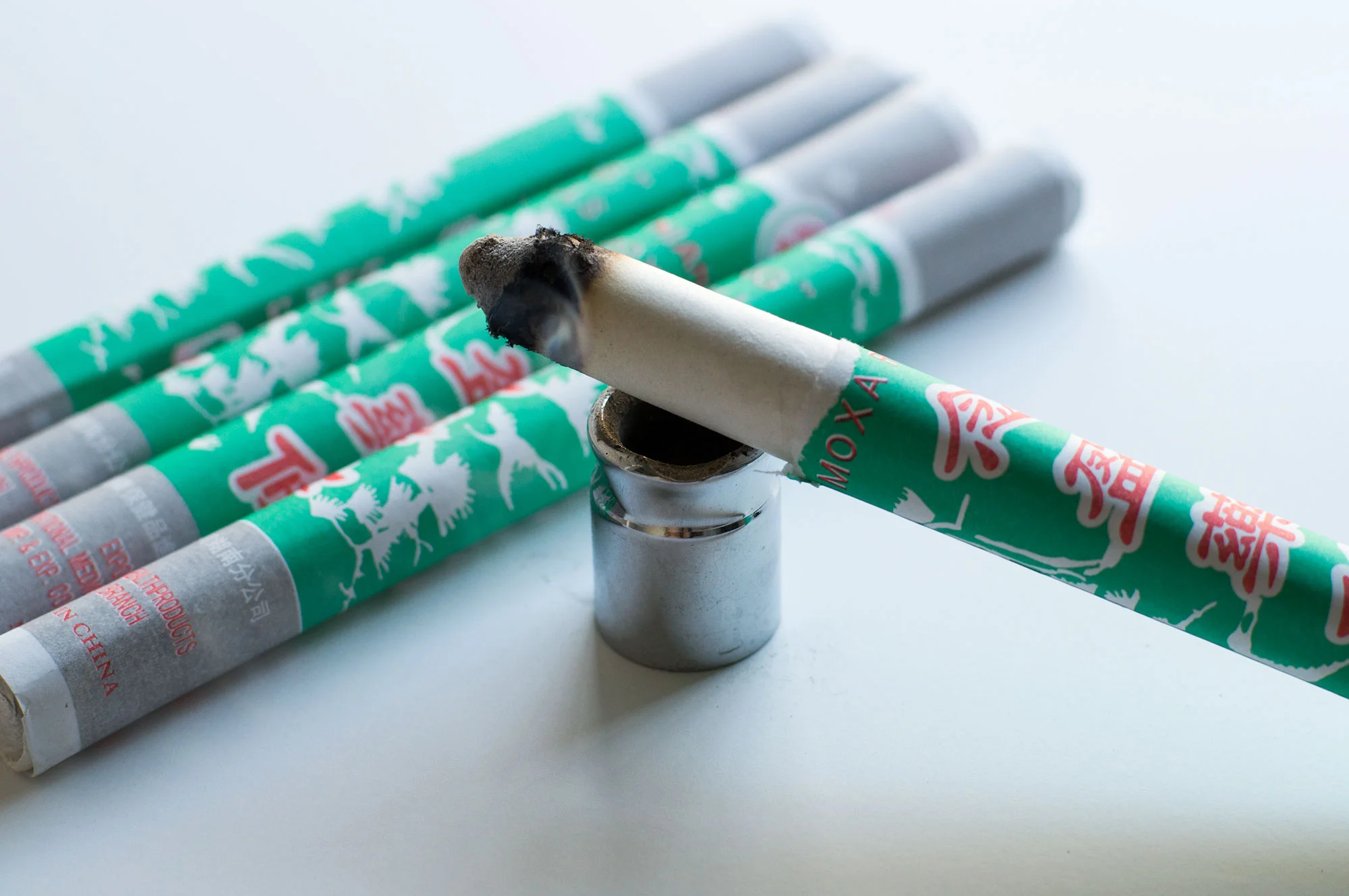 Moxa is something I do at home as part of my self-care routine. Moxibustion refers to the burning of the herb mugwort, which has a rich history of use in many herbal medicine traditions. I use sticks that are rolled like big cigars, light one end, and then use it to warm specific points on my body. You hold it about an inch away from the skin and move it in small circles to warm a point.